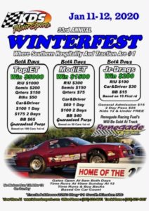 The Great American Bracket Races is please to announce that KDS Motorsports in Kinston, NC will host a Great American Guaranteed Million Gambler’s Race at Kinston Dragstrip’s Winterfest Jan. 11-12. Winterfest will feature two days of Racing for the Top ET $5,000.00 to WIN, Mod ET $1,500 t0 Win and Jr. Dragsters also in action.