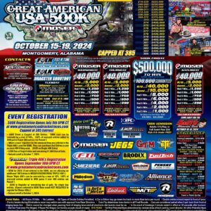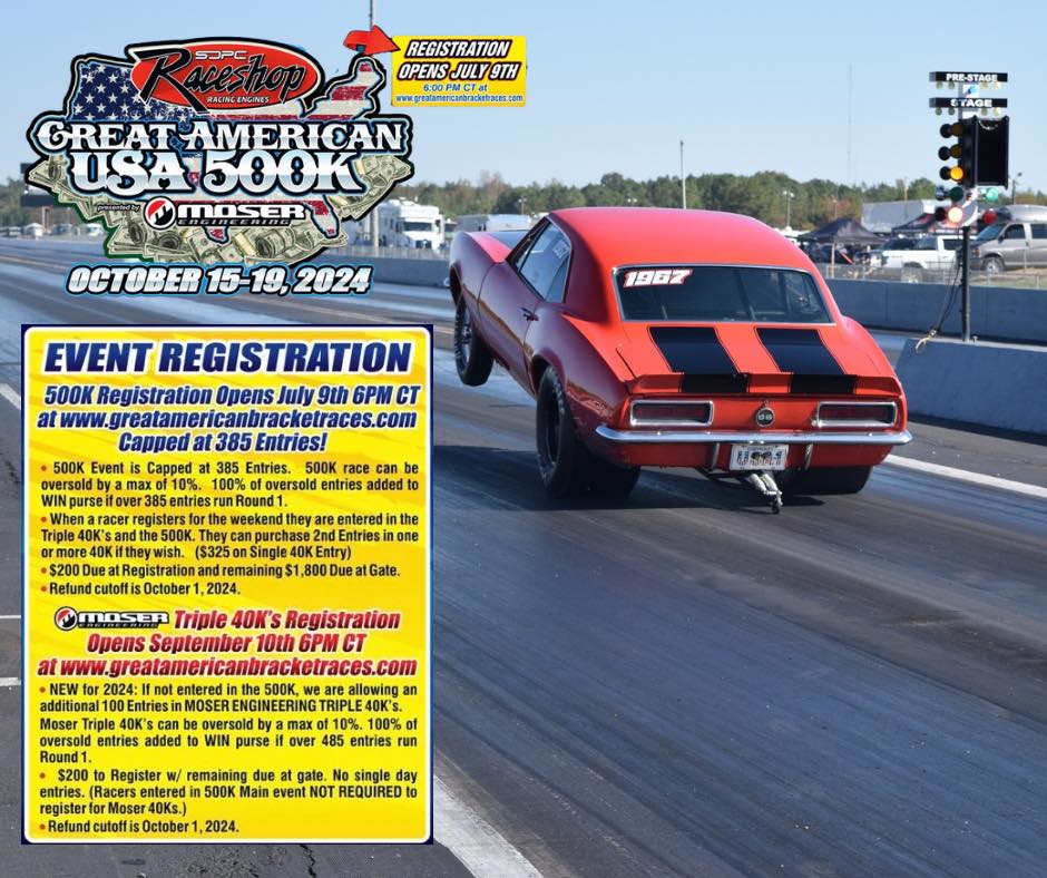 July 9th @ 6pm Central – BE READY! 385 entries will be live on www.greatamericanbracketraces.com for our GABR USA SDPC Raceshop $500k! Don’t miss out on our highest paying race of the year with $500,000 and THREE Moser Engineering $40k’s at Montgomery International Dragway