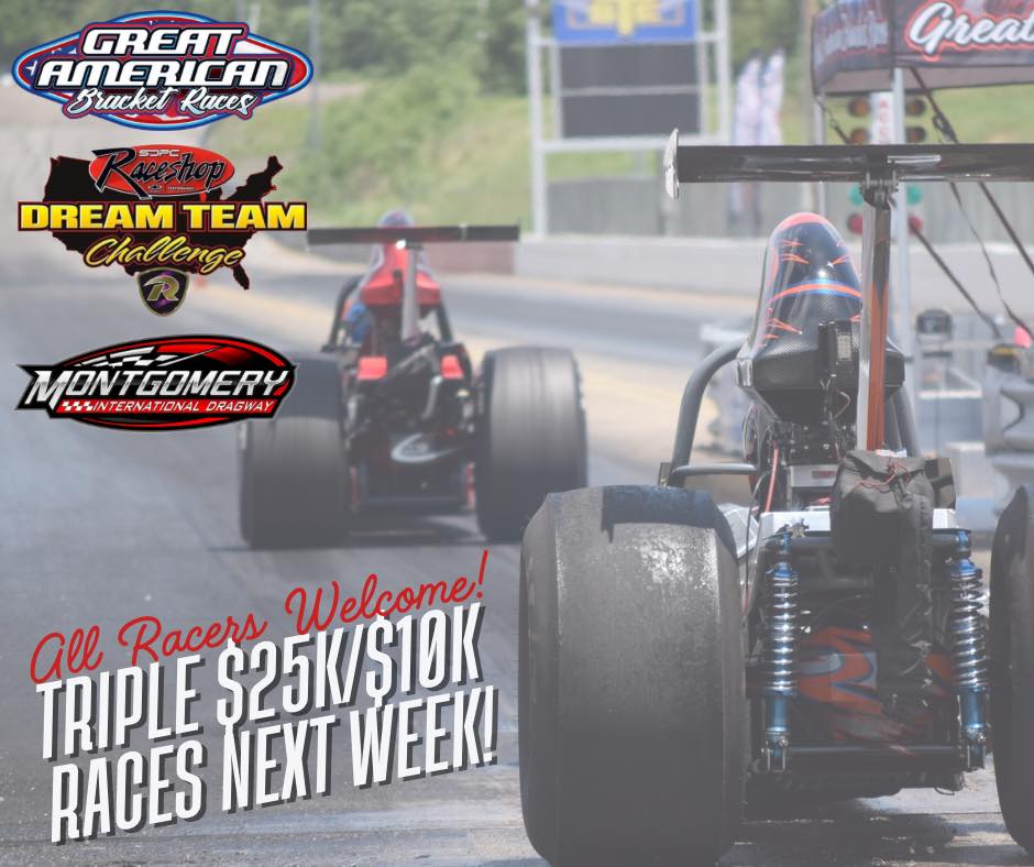 Friendly Reminder – You do NOT have to be on a Dream Team to race in our Moser Engineering Triple Top Bulb $25ks and Triple Bottom Bulb $10ks next Thursday, Friday, and Sunday at Montgomery International Dragway! All racers welcome – pay at the gate!