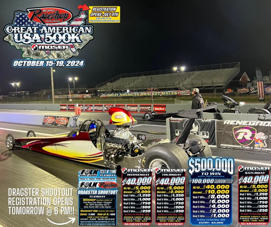 Tuesday Dragster Shootout registration opens Tuesday @ 6pm central! Accepting 128 entries on www.greatamericanbracketraces.com! Winner will receive choice of a stage 1 Folk Racecars Dragster OR SDPC Raceshop 582 Head Hunter BBC engine! Runner up will receive the other. Registration Link HERE https://form.jotform.com/232396862715162 .