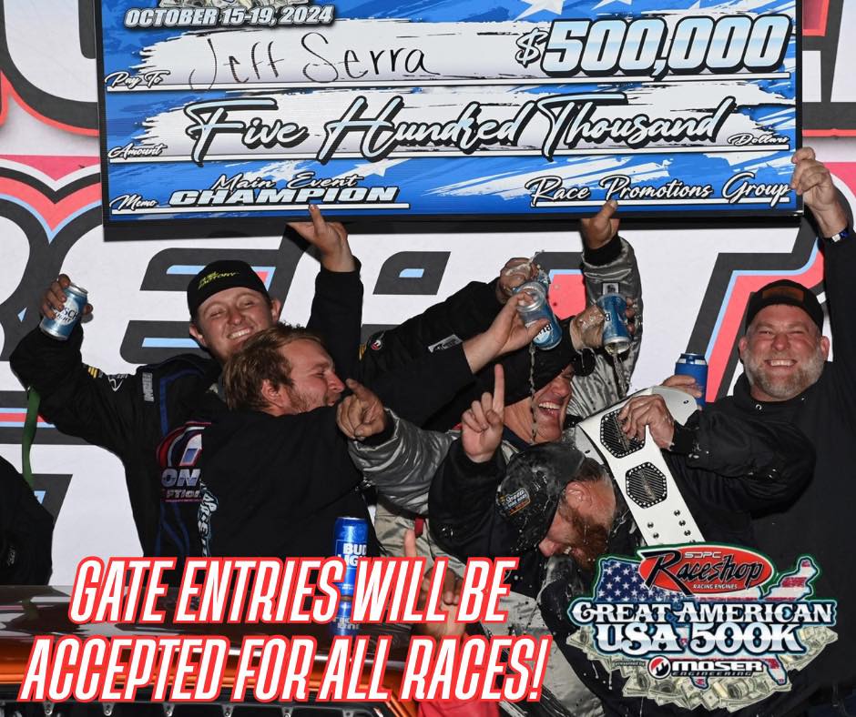 Due to the number of pre-entries for the 3rd Annual GABR USA SDPC Raceshop $500k, we will be accepting gate entries for ALL races during the week.