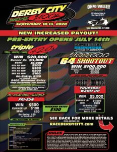 The Derby City 100K Features three 20K Races and a Mega 64 Car $100,000.00 Shootout. Only Accepting 300 entries in the three 20K races. Register today at www.racederbycity.com
