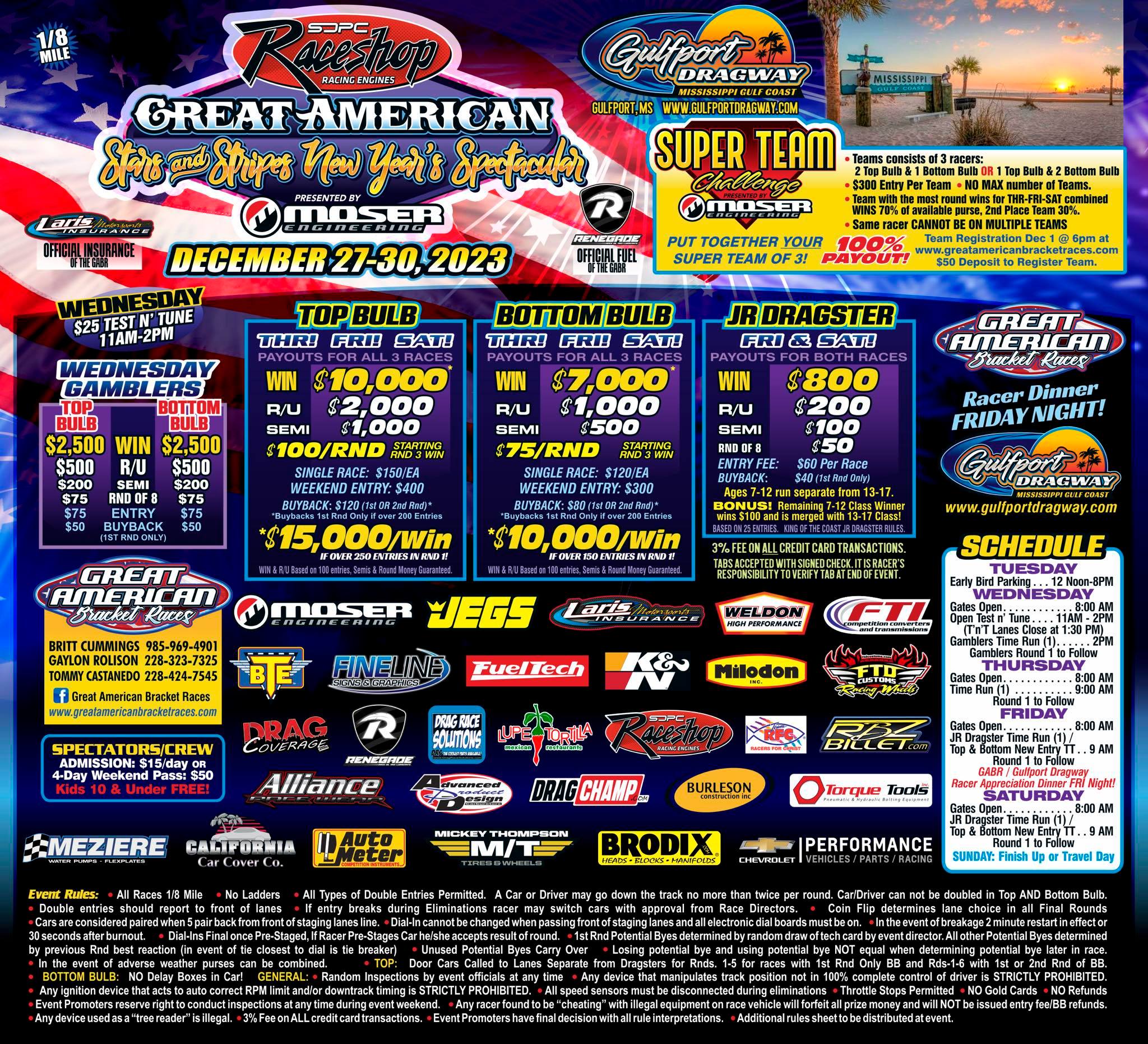 The SDPC Raceshop Great American Stars and Stripes New Year’s Spectacular JUST Month Away. January 1-4 at Gulfport Dragway, Gulfport, MS.
