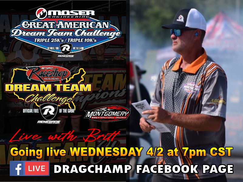 Britt Cummings will join me LIVE Wednesday April 2nd at 7pm CST to talk about one of the coolest races of the year, the Great American Bracket Races Dream Team Challenge! Join us to get the latest updates on the Dream Team and the Triple 25’s/ Triple 10’s coming to Montgomery International Dragway May 14-18th.