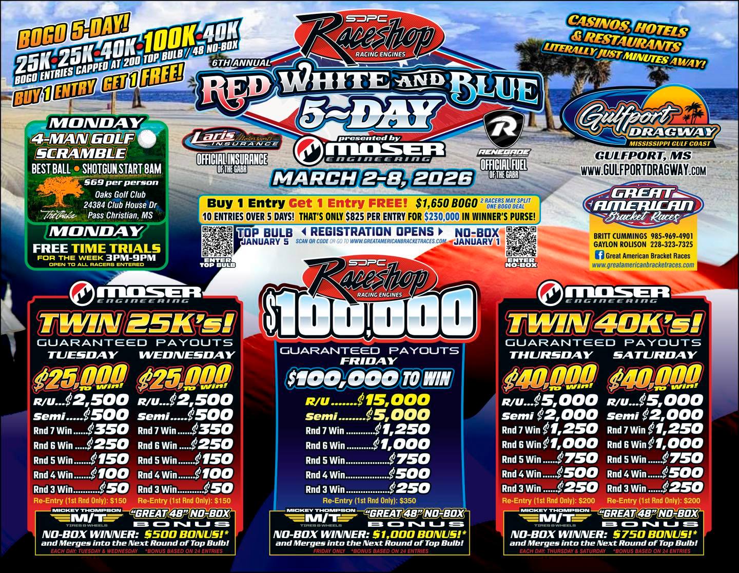 Top Bulb Registration begins THIS THURSDAY January 15 for the SDPC RaceShop Great American Red, White and Blue 5 Day at Gulfport Dragway- Gulfport, MS March 2-8